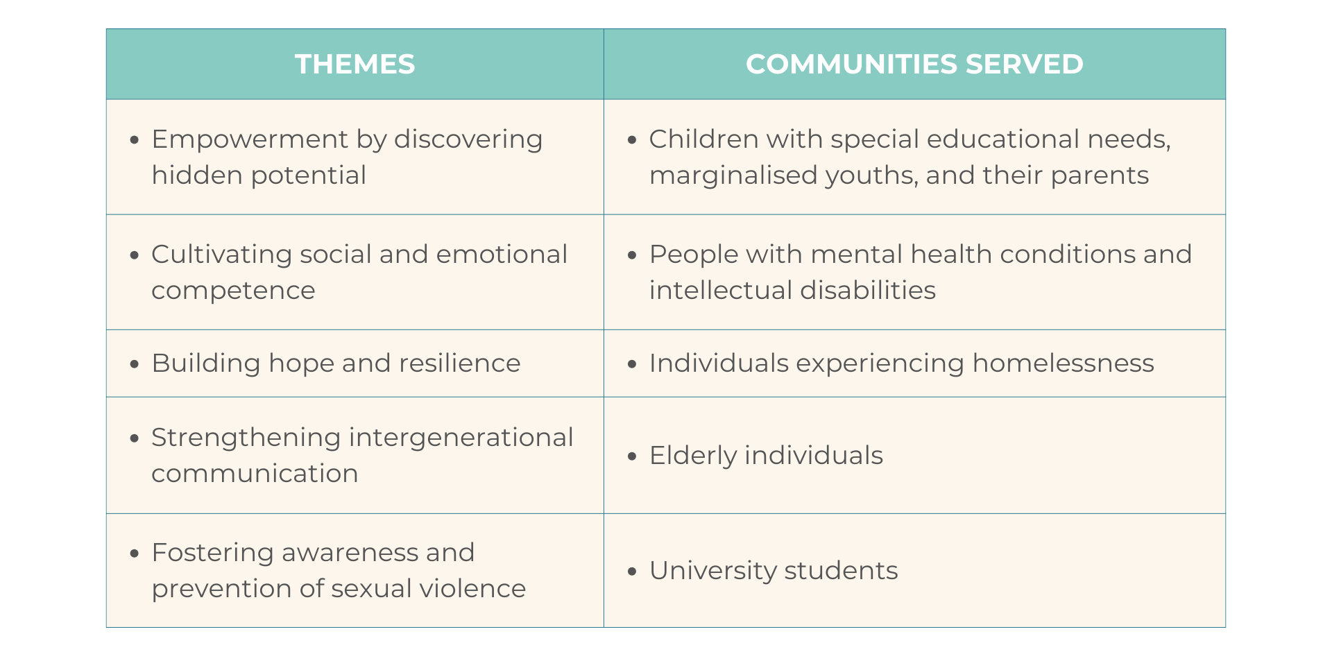 The capstone project is a mandatory course that students majoring in the subject undertake in their final year of study. This project offers an opportunity for students to consolidate their knowledge and skills related to key communication and counselling concepts through experiential learning. In this course, students work collaboratively in groups with community organisations to address significant issues facing specific communities in Hong Kong. Students reflect on and analyse their learning through writing, developing a public exhibition using creative methods, and delivering an oral presentation. The project emphasises the integration of compassionate communication in teamwork throughout the process. Below are some themes and communities that our students have served.
