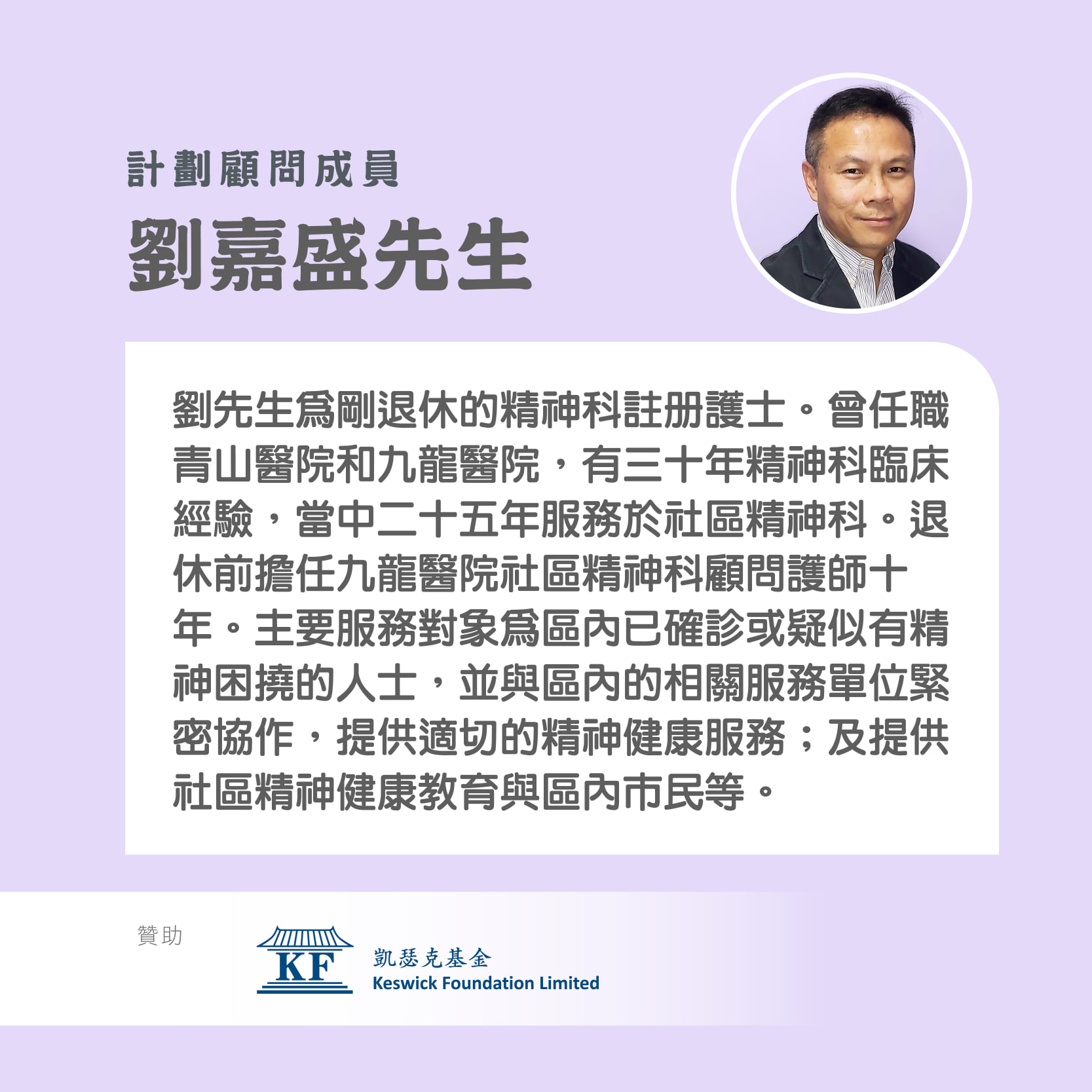 講者:劉嘉盛先生—剛退休的精神科註册護士。曾任職青山醫院和九龍醫院,有30年精神科臨床經驗,當中25年服務於社區精神科。退休前擔任醫院管理局,九龍中醫院聯網,九龍醫院,社區精神科顧問護師10年。主要服務對象為區內已確診或疑似有精神困撓的人士,並與區內的相關服務單位緊密協作,提供適切的精神健康服務;及提供社區精神健康教育與區內市民等。