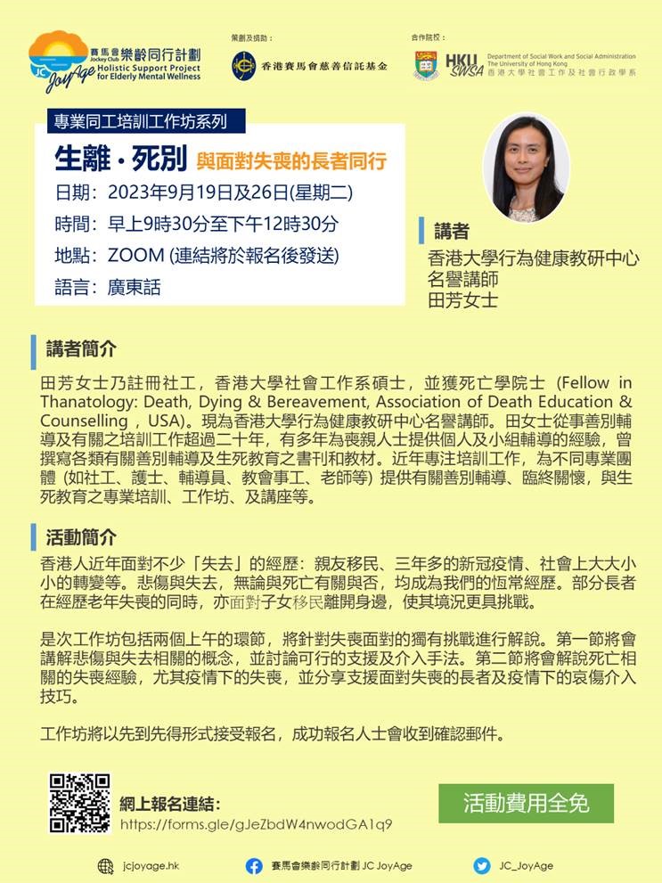 This two half-day training is designed to address the unique challenges of bereavement and losses in general. In the first session, the concepts of grief and losses in general would be introduced. Possible support and intervention approaches would also be discussed. In the second session, the experience of death-related loss, especially bereavement in the context of pandemic, would be highlighted. Interventions particularly for supporting bereaved elderly as well as pandemic grief would also be shared.