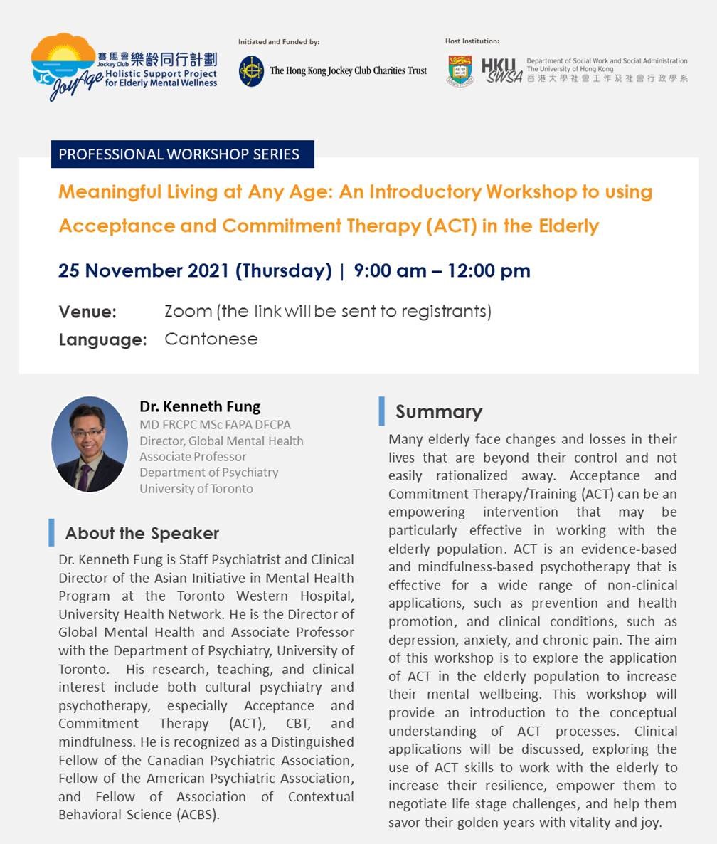 Many elderly face changes and losses in their lives that are beyond their control and not easily rationalized away. Acceptance and Commitment Therapy/Training (ACT) can be an empowering intervention that may be particularly effective in working with the elderly population. ACT is an evidence-based and mindfulness-based psychotherapy that is effective for a wide range of non-clinical applications, such as prevention and health promotion, and clinical conditions, such as depression, anxiety, and chronic pain. The aim of this workshop is to explore the application of ACT in the elderly population to increase their mental wellbeing. This workshop will provide an introduction to the conceptual understanding of ACT processes. Clinical applications will be discussed, exploring the use of ACT skills to work with the elderly to increase their resilience, empower them to negotiate life stage challenges, and help them savor their golden years with vitality and joy.