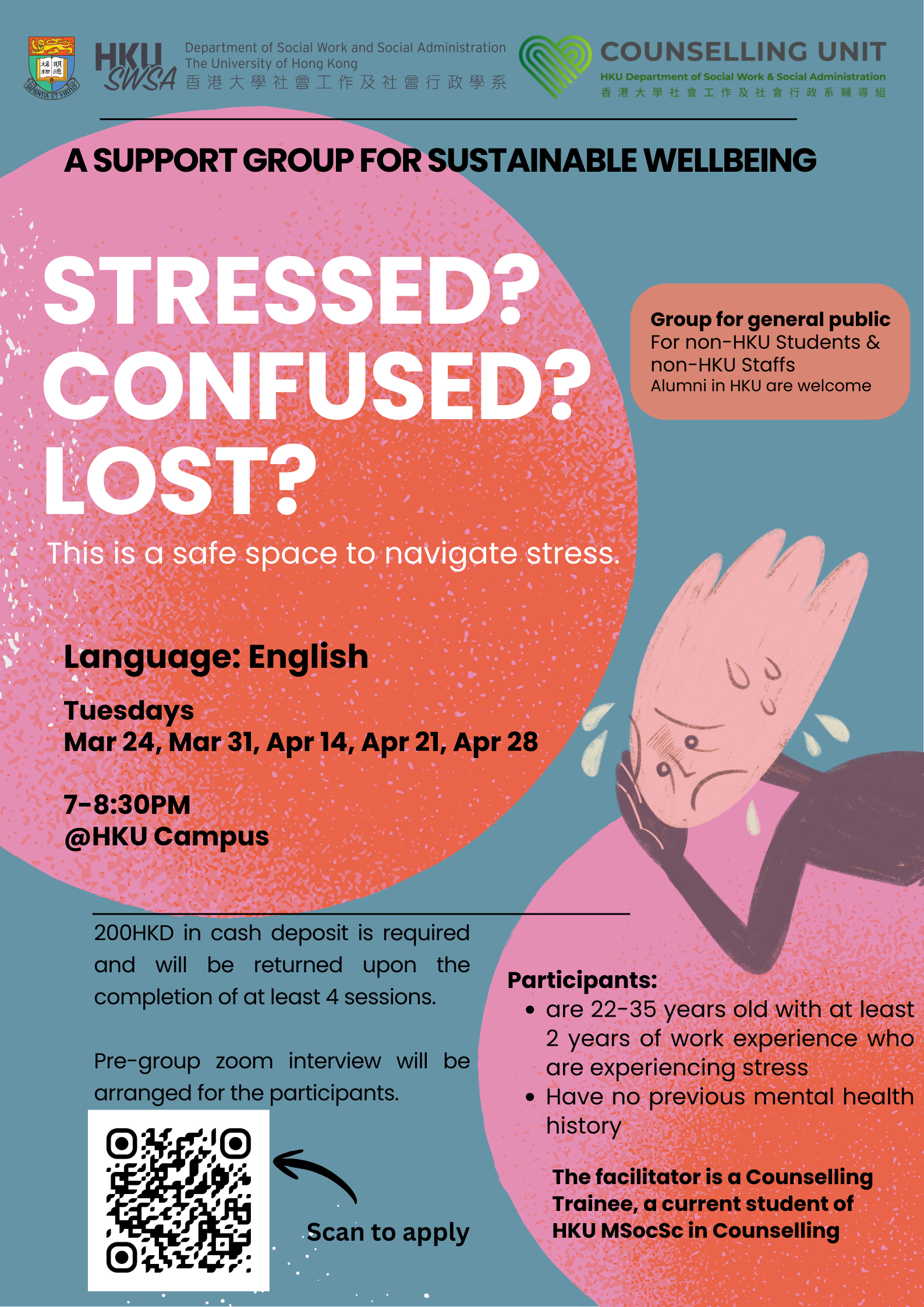 This peer support group is a safe space facilitated by a counselling trainee, a current student of MSocSc in Counselling at HKU. Alongside peers who are experiencing similar emotions, you will unpack the roots of the distress, learn hands-on skills for stress management and boundary setting.