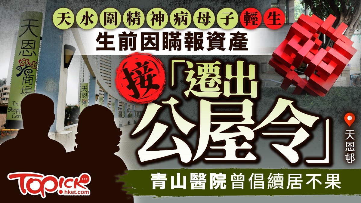 天恩邨/房署/遷出/輕生丨天水圍天恩邨一對患有精神病母子,被指因13年前申請公屋時未有如實申報資產,因此遭房屋署發信要求遷出。母子曾就此作出上訴,並獲青山醫院發出證明書,建議容許二人繼續在單位居住,不過,今年3月上訴委員會最終裁定上訴失敗,涉案母子則先後於今年4月20日及7月31日墮樓亡。
