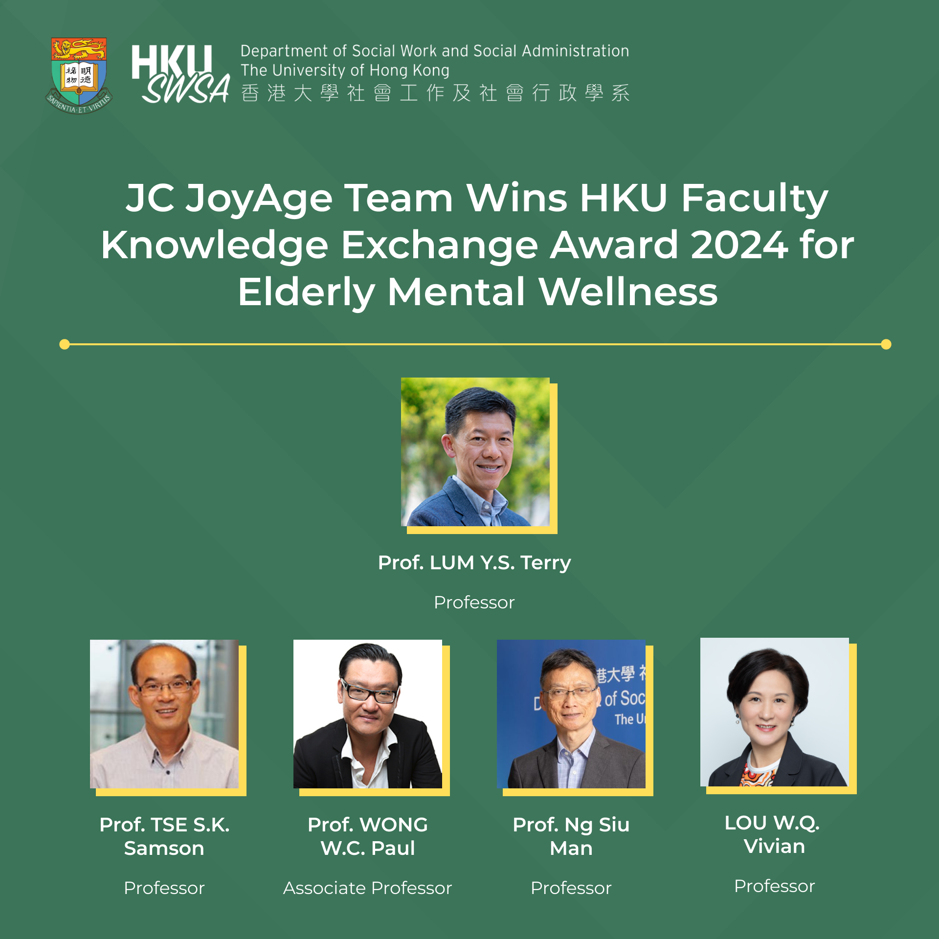 We are delighted to announce that Professor LUM Y.S. Terry and team members—Prof. TSE S.K. Samson, Prof. WONG W.C. Paul, Prof. Ng Siu Man, Prof. LOU W.Q. Vivian, and collaborators—have received the Faculty Knowledge Exchange Awards 2024 (Team) from the Knowledge Exchange Office at The University of Hong Kong for JC JoyAge – Holistic Support Project for Elderly Mental Wellness. As highlighted by the HKU KE Office, the Faculty Knowledge Exchange Awards recognise projects that create demonstrable, real-world impact by translating academic expertise into community benefit. JC JoyAge exemplifies this mission through its interdisciplinary, collaborative approach to strengthening mental wellness support for older adults, co-developing solutions with community partners, and sharing practical tools, training, and models that improve access, care pathways, and service quality. This recognition underscores the team’s contribution to building community capacity and promoting evidence-informed, person-centred practices across Hong Kong.