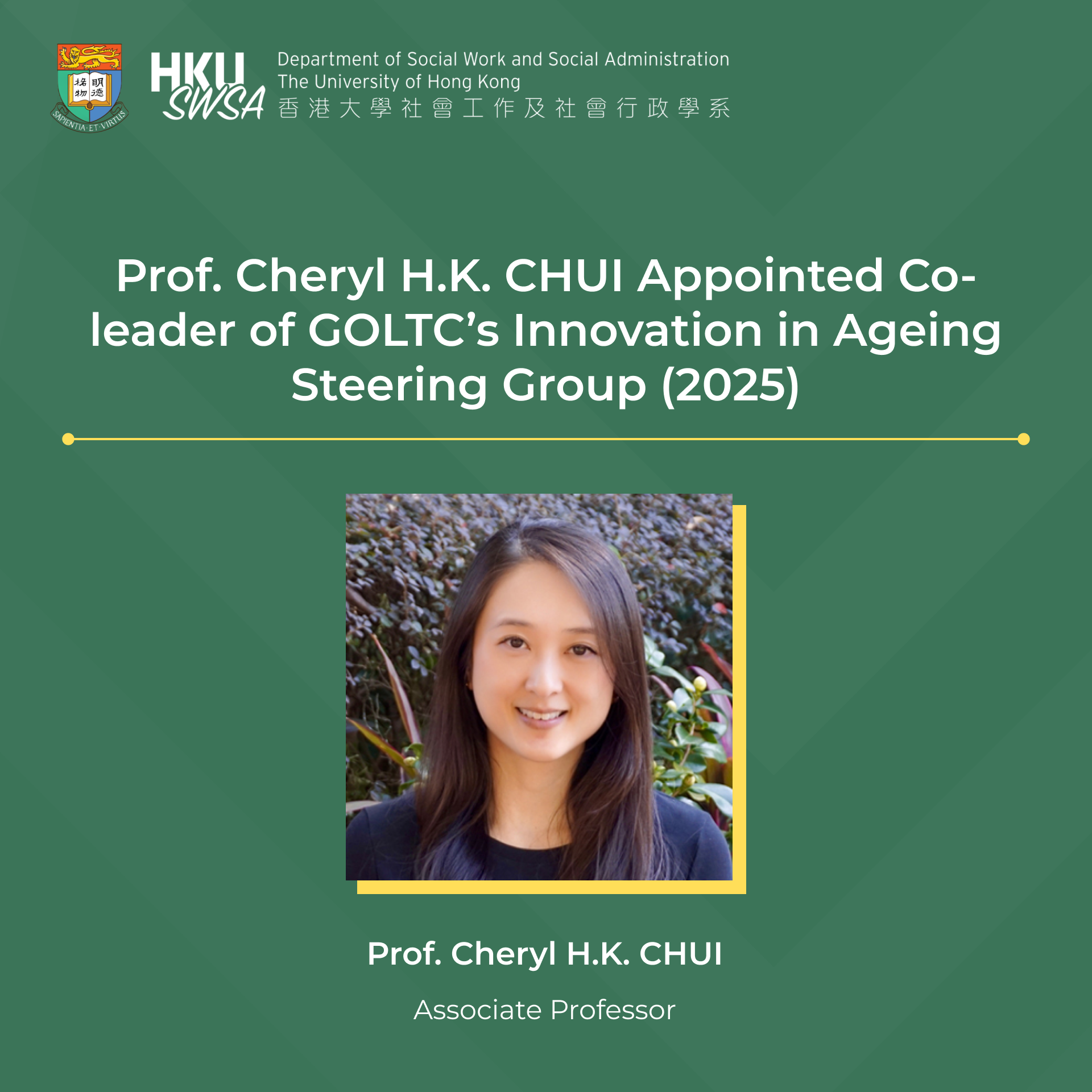 Prof. Cheryl H.K. CHUI Appointed Co-leader of GOLTC’s Innovation in Ageing Steering Group (2025)