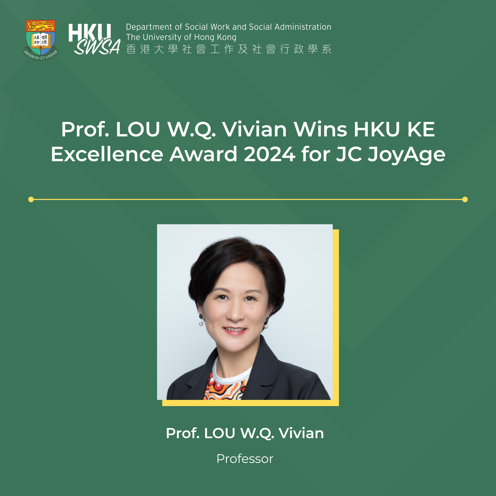 HKU has conferred the 2024 KE Excellence Award on Dr. LOU W.Q. Vivian for ?JC JoyAge ? Holistic Support Project for Elderly Mental Wellness.? The KE Excellence Award is the University?s premier recognition for knowledge exchange and is showcased on HKU?s Research Impact ? Honours and Awards portal, where awardees and their projects demonstrate how academic work delivers benefits that extend well beyond campus. As the portal notes, the honour highlights initiatives that move past publication to achieve real-world change through collaboration with external partners, measurable outcomes for users and communities, and strong potential for wider adoption.