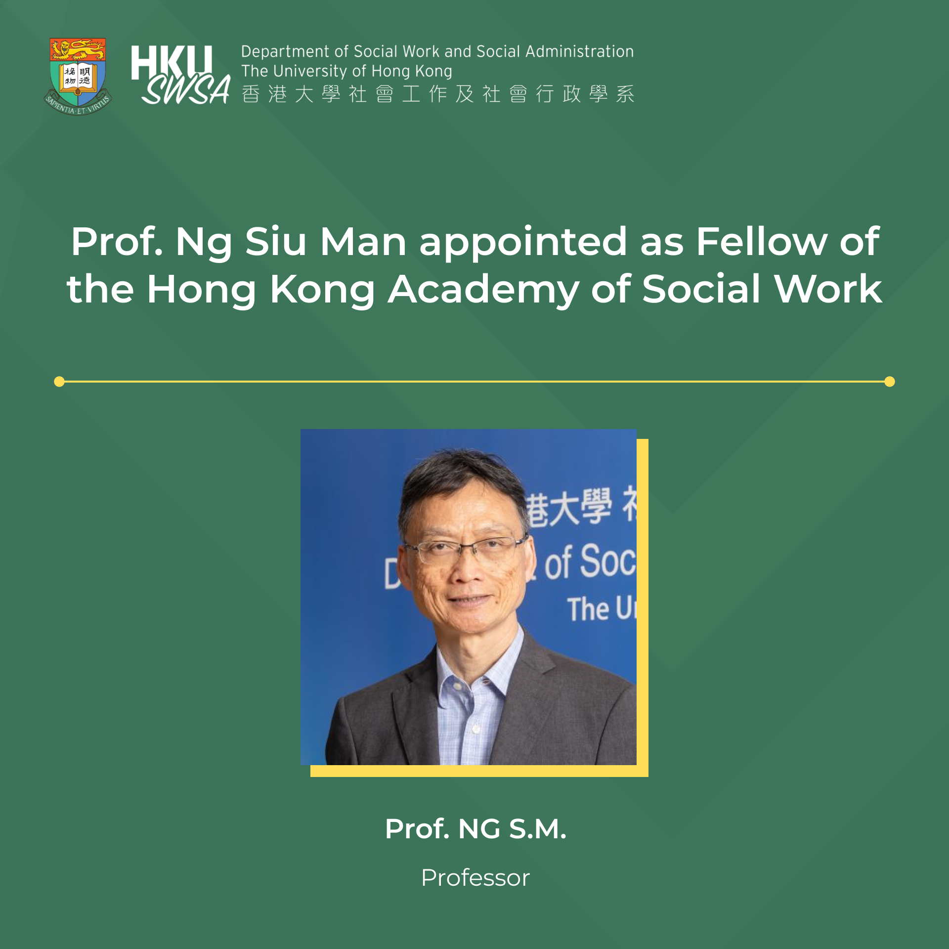 Prof. Ng Siu Man appointed as Fellow of the Hong Kong Academy of Social Work